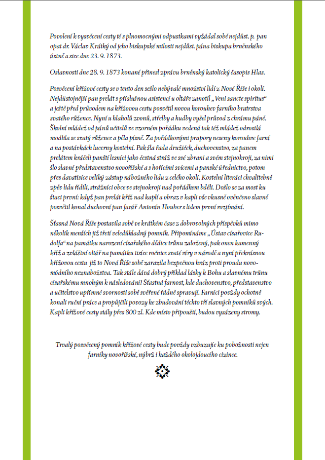 Der Kreuzweg von Nová Říše beginnt…. Der Kreuzweg von Nová Říše ist ein sehr schöner Ausflug, der durch die einzigartige Landschaft führt. Auf diesem Weg werden Sie die einzelnen gemauerten Kapellen begleiten, die für einige Jahrzehnte nicht gepflegt wurden. Nach einiger Zeit des Wanderns führen die Kapellen zum Ende des Kreuzweges, zum Hügel Spravedlnost (Gerechtigkeit), wo man einen wundervollen Ausblick auf Nová Říše und die Umgebung hat. Gehen Sie auf Spuren der GENIA LOCI dieses Kulturdenkmals und entdecken Sie den Zauber des Kreuzweges von Nová Říše, der Schritt für Schritt den historischen und kulturellen Charme der Umgebung entdecken lässt. Unser Lehrpfad beginnt bei majestätischen Prämonstratenser Kloster und der Barockkirche des Hl. Petrus und Paulus. Der Kreuzweg von Nová Říše ist im Register der tschechischen Kulturdenkmäler unter Nr. 28145/7-5043 erfasst. Foto: Vojtěch Krajíček