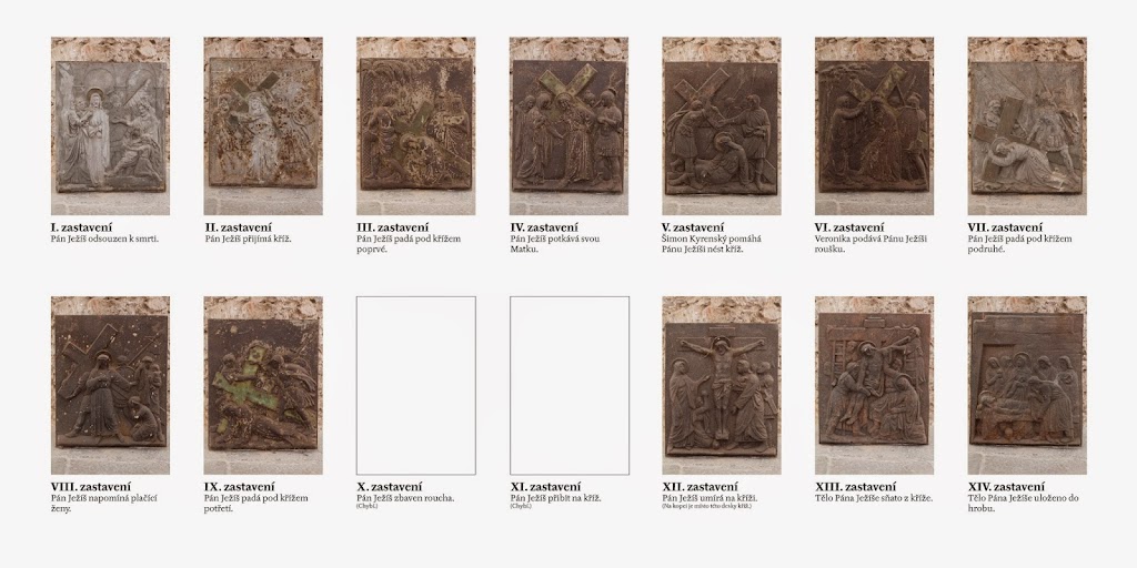 Detailübersicht der einzelnen Stationen, wie sie nach und nach folgen. Zwei Bilder sind nicht mehr erhalten geblieben. Es geht um gegossene Platten (Bilder), die in den einzelnen Kapellen des Kreuzweges eingesetzt wurden. Diese Platten sind im Depot des Prämonstratenser Klosters verwahrt. In Zukunft wird nachgedacht, diese in Form einer Kopie wieder in die Nischen der Kapellen zu montieren, im besten Falle auch leicht färbig, damit die einzelnen Szenen wieder hervorgehoben werden können.