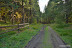 Rozcestí, kde turistická trasa propojuje přímou zkratkou lesem serpentýny zpevněné cesty.