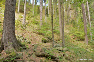 Turistická trasa následně schází ze zpevněné lesní cesty a vede úbočím Kněhyně. Úsek patří k nejhezčím a kouzelná atmosféra dává tušit blízkost tajemného cíle. Trasa také nabízí pěkné výhledy které prohlédnete v detailním popisu úseku.